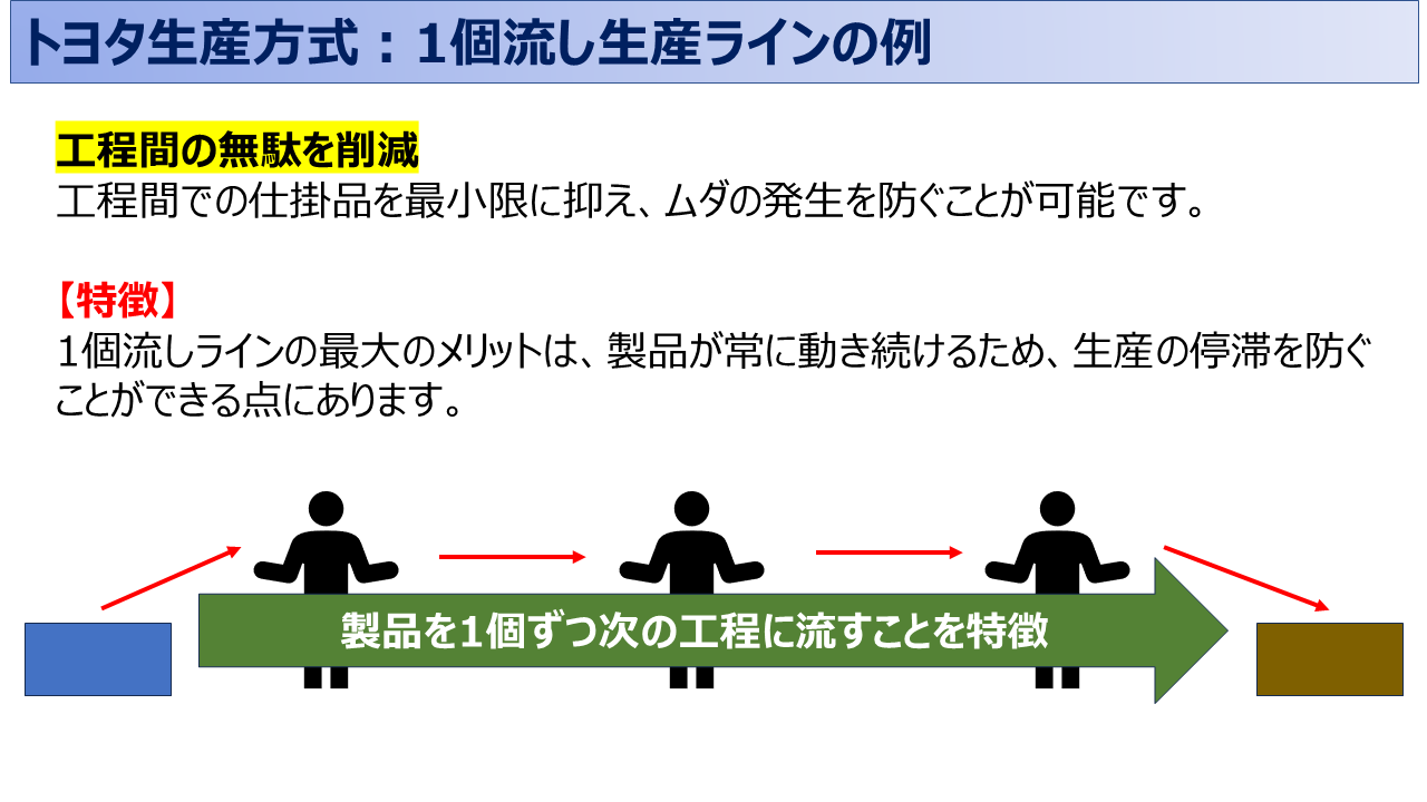 また、品質管理の面でも優れており、不良品が発生した場合はすぐに次の工程に伝達され、早期に対応が行われ、これにより、不良品の累積や生産ライン全体への悪影響が最小限に抑えられます。さらに、1個ずつ生産を進めることで、各工程の作業者が問題を早期に発見しやすくなり、迅速なカイゼン(改善)が可能になります。