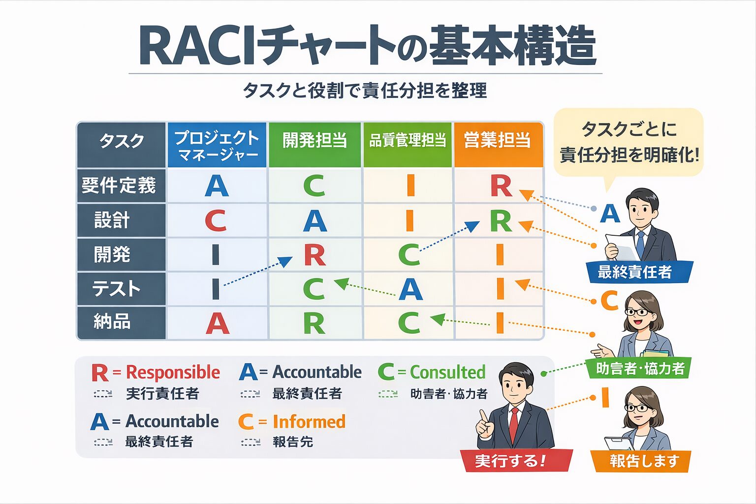 この形式により、誰がどの立場で関与するのかが一目でわかり、責任の重複や抜け漏れを防ぎます。PMBOKでも推奨される手法であり、PMP試験でも出題対象となる重要な概念です。